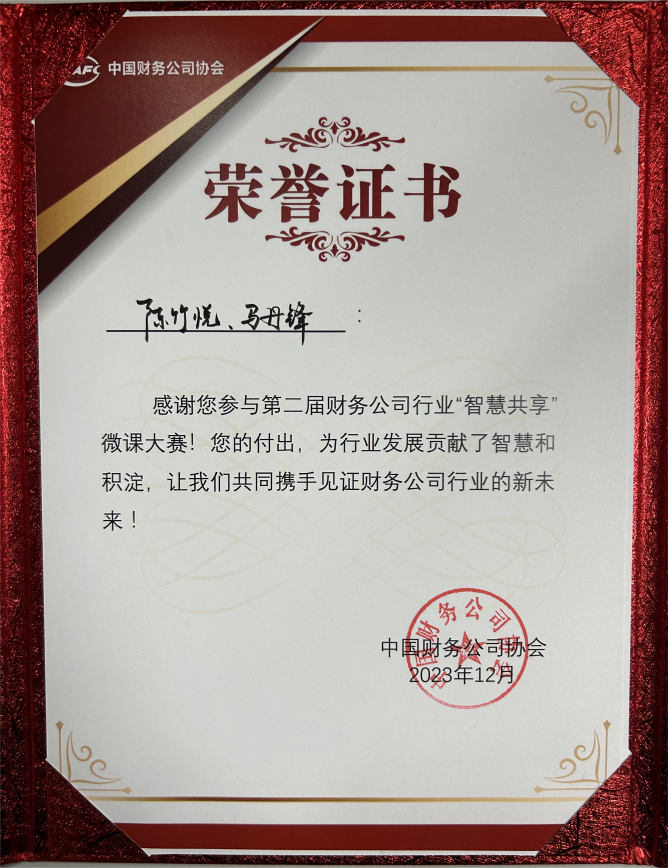近期,公司青年职工陈竹悦、马丹锋参与第二届财务公司行业“智慧共享”微课大赛并受到中国财务公司协会表彰。